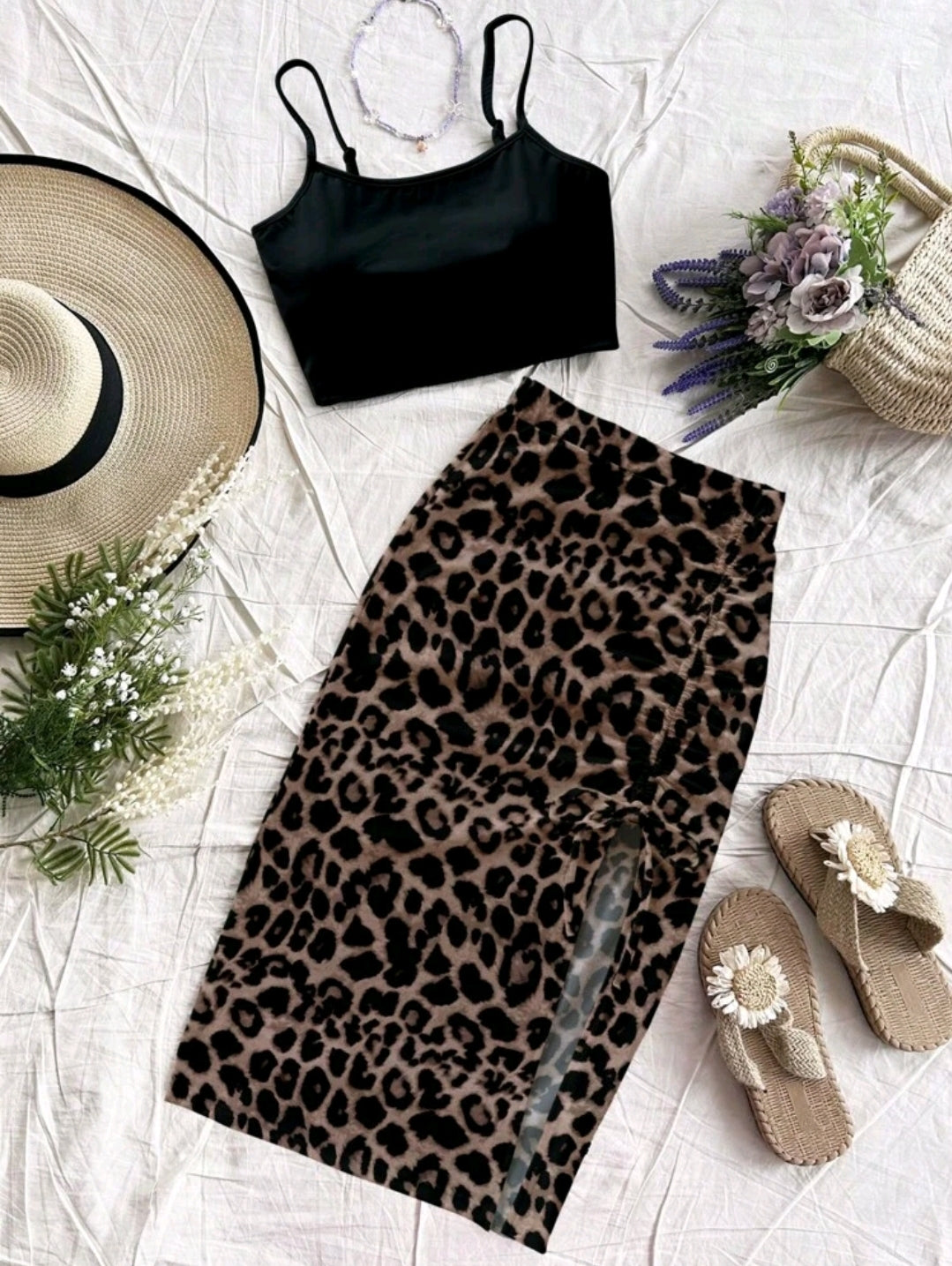 Casual Vocation, Leopard Skirt, 2 Pieces Set